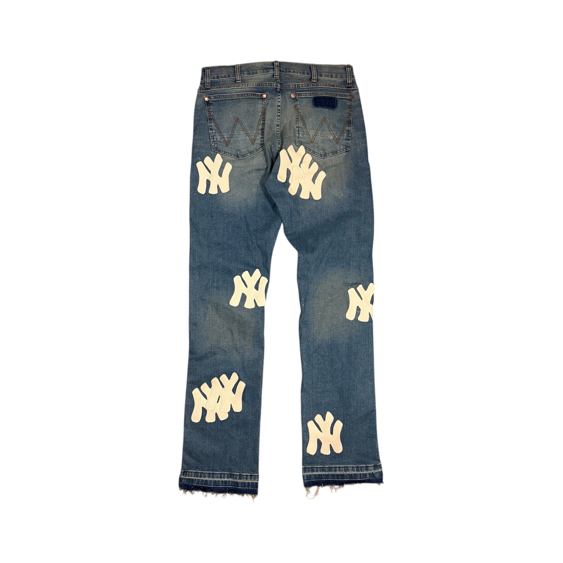 Jeans estilo viejos corte recto con detalles en piel y bordados